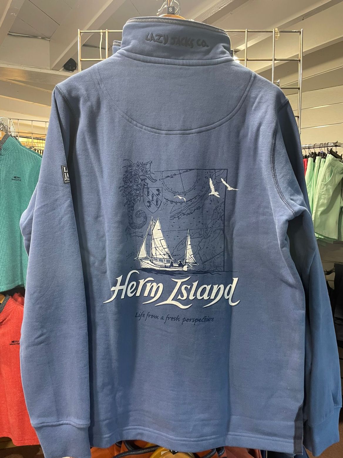 Herm Island Lazy Jacks bespoke sweatshirt. Sailing boat print on back.